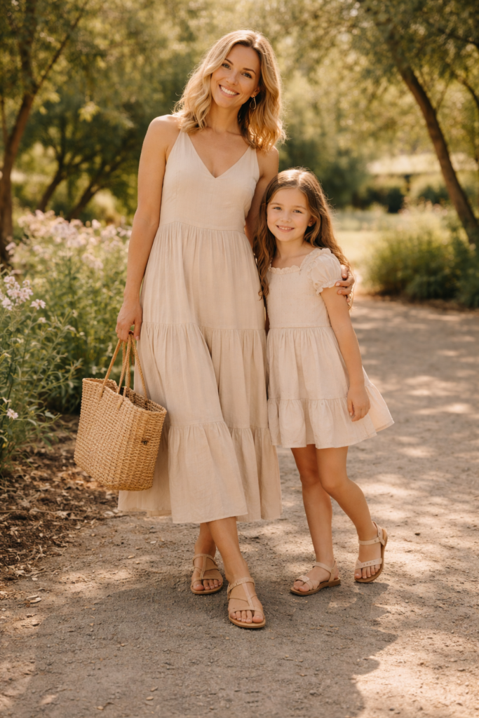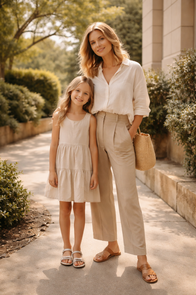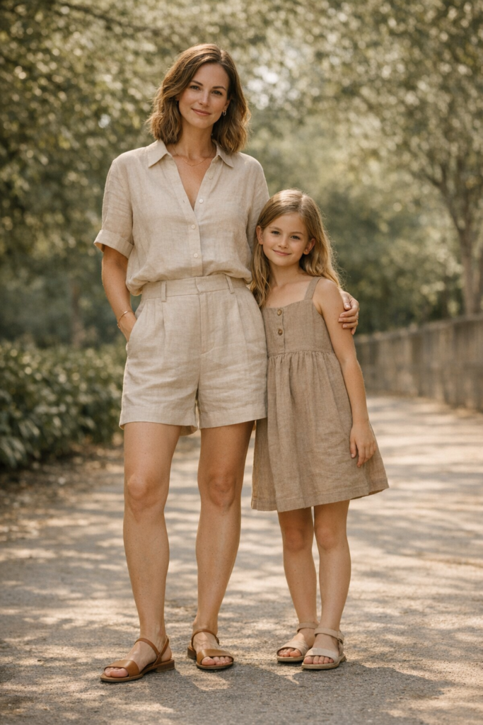 Linen sets are a warm-weather essential, and they translate beautifully into coordinated mother and daughter spring family outfit ideas. A linen short or pant set for mom paired with a simple linen dress or two-piece for daughter feels cohesive and elevated. I love earthy tones like sand, clay, or soft olive for a timeless feel. Keep accessories minimal to let the fabric and fit shine.