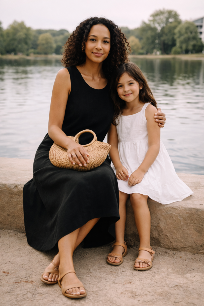 Black and white isn’t just for winter, and it creates striking mother and daughter spring family outfit ideas when done lightly. Choose breathable fabrics and airy cuts to keep the look seasonal. A sleeveless black dress for mom paired with a white dress or top for the daughter keeps things fresh and intentional. Add woven accessories to soften the contrast.