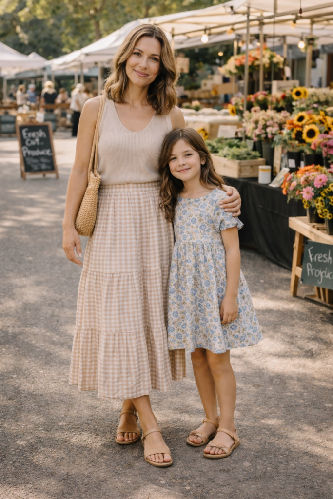 Pattern mixing can be fun and stylish when approached thoughtfully in mother-daughter spring family outfit ideas. I suggest keeping patterns within the same color family, like gingham paired with small florals. Mom’s outfit can anchor the look with a subtler pattern, while daughter’s can feel more playful. Neutral shoes help balance the visual interest.