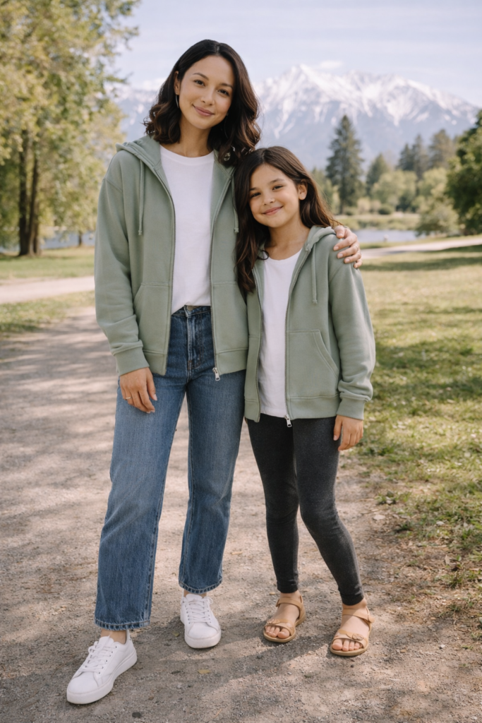 This relaxed approach to mother and daughter spring family outfit ideas focuses on comfort without sacrificing style. Think graphic sweatshirts or light jackets in the same shade layered over everyday basics. Mom can style hers with straight-leg jeans, while her daughter pairs hers with leggings or a skirt. It’s an easy go-to for busy spring days that still feels coordinated.