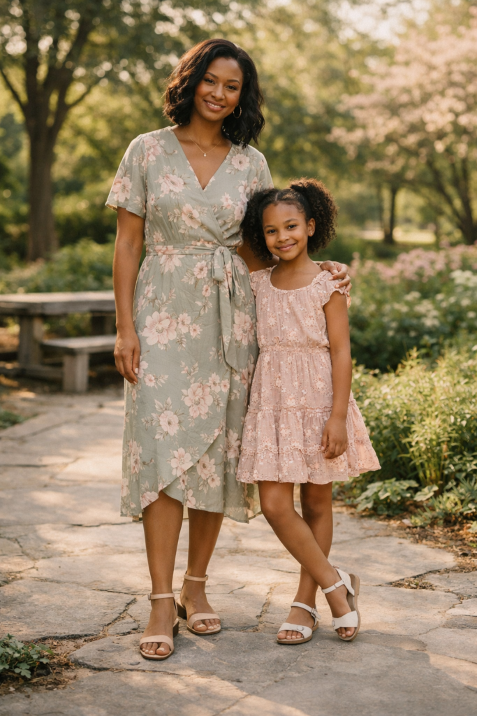 Florals are a spring staple, and choosing similar color stories helps this mother and daughter spring family outfit idea feel intentional, not identical. I prefer selecting dresses with different prints but shared hues like blush, sage, or soft blue. Mom’s silhouette can be midi or wrap-style, while daughter’s can be playful with movement and comfort in mind. Finish the look with ballet flats or ankle-strap sandals for a polished but easy appearance.