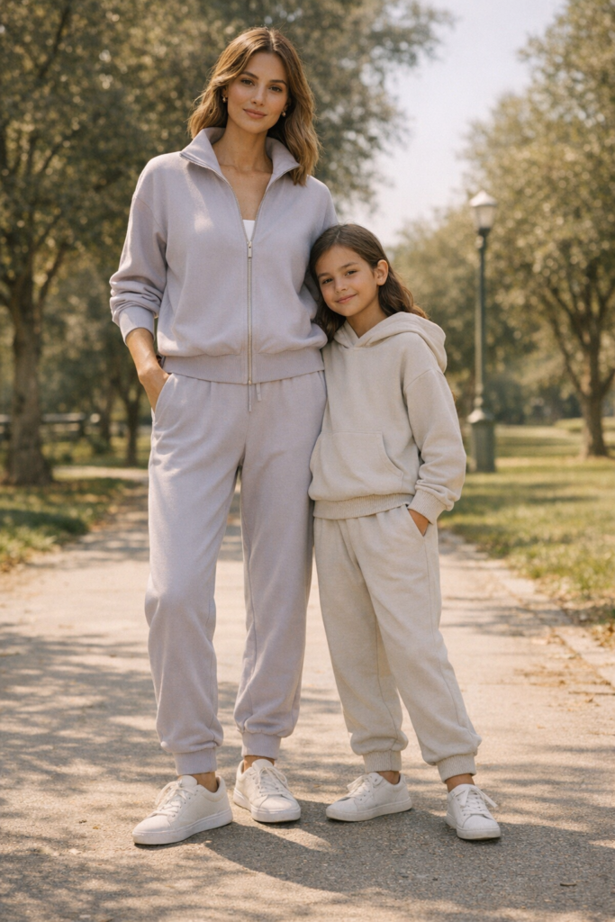 Athleisure can absolutely be coordinated without feeling sloppy, making it one of my favorite casual mother and daughter spring family outfit ideas. Think matching or complementary jogger sets in muted spring shades like lavender, oatmeal, or soft green. Mom can elevate hers with a structured zip jacket, while daughter keeps it playful with a hoodie or crewneck. This look is perfect for weekend errands, travel days, or relaxed family walks.