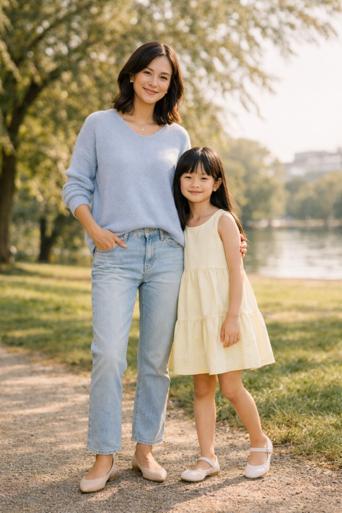 Pastels instantly signal spring, and when styled well, they make charming mother and daughter spring family outfit ideas. Choose soft shades like powder blue, lavender, or pale yellow in different clothing styles rather than matching pieces. A pastel knit with light denim works well for mom, while a pastel dress or skirt keeps daughter’s look light and playful. Neutral shoes ground the look and keep it sophisticated.