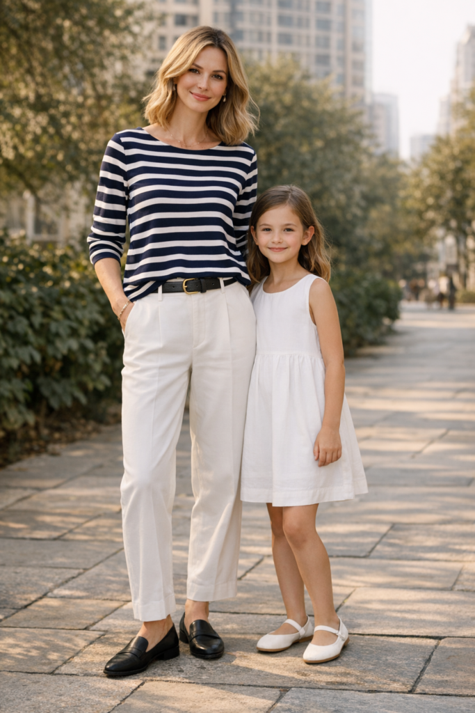 Stripes are timeless and incredibly versatile for mother and daughter spring family outfit ideas. I love using stripes on one outfit and solids in a matching color for the other to keep visual interest high. For example, mom in a navy-and-white striped top with tailored pants pairs perfectly with daughter in a solid navy dress. This combination feels effortless while still intentionally styled.