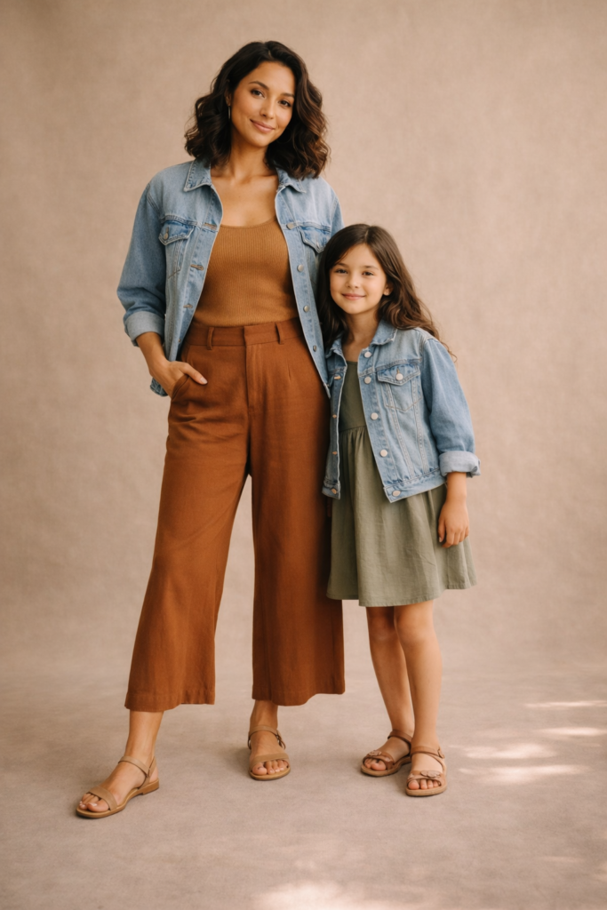 Earth tones like rust, sage, and camel feel grounded yet seasonal, making them ideal for mother-daughter spring family outfit ideas. Pair these shades with light denim jackets or jeans to add structure and contrast. Mom can lean into tailored pieces, while daughter’s look stays soft and flexible. This approach feels modern, relaxed, and incredibly wearable.