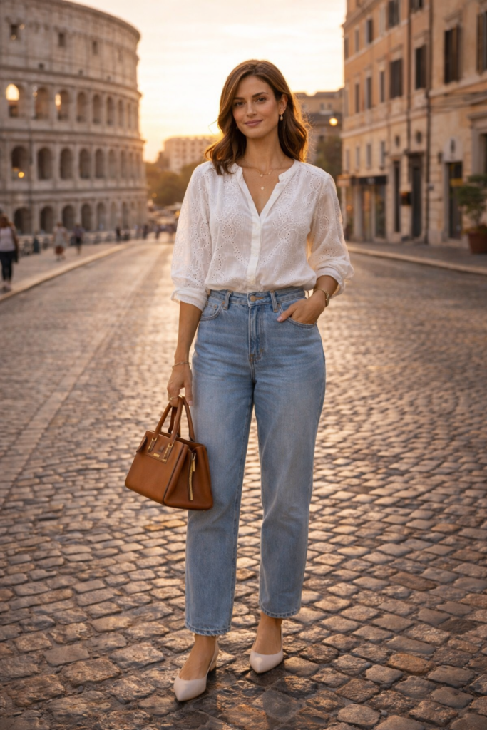 Light-wash, relaxed-fit jeans are ideal for cooler evenings or northern European destinations. Pair them with a soft, feminine blouse featuring subtle ruffles or embroidery. The contrast between structured denim and delicate fabric feels balanced and stylish.