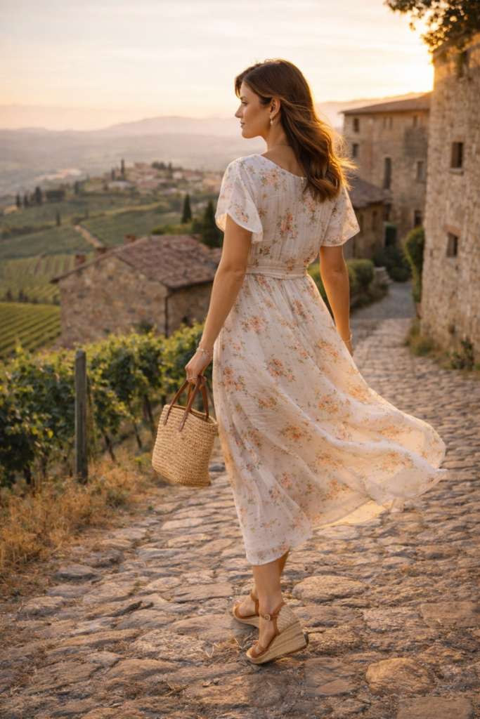 A floral midi dress is a romantic staple for Italy vacation outfits, women adore for countryside escapes. Choose delicate prints rather than oversized patterns for a more refined feel. Light fabrics that move with the breeze add softness and elegance.
