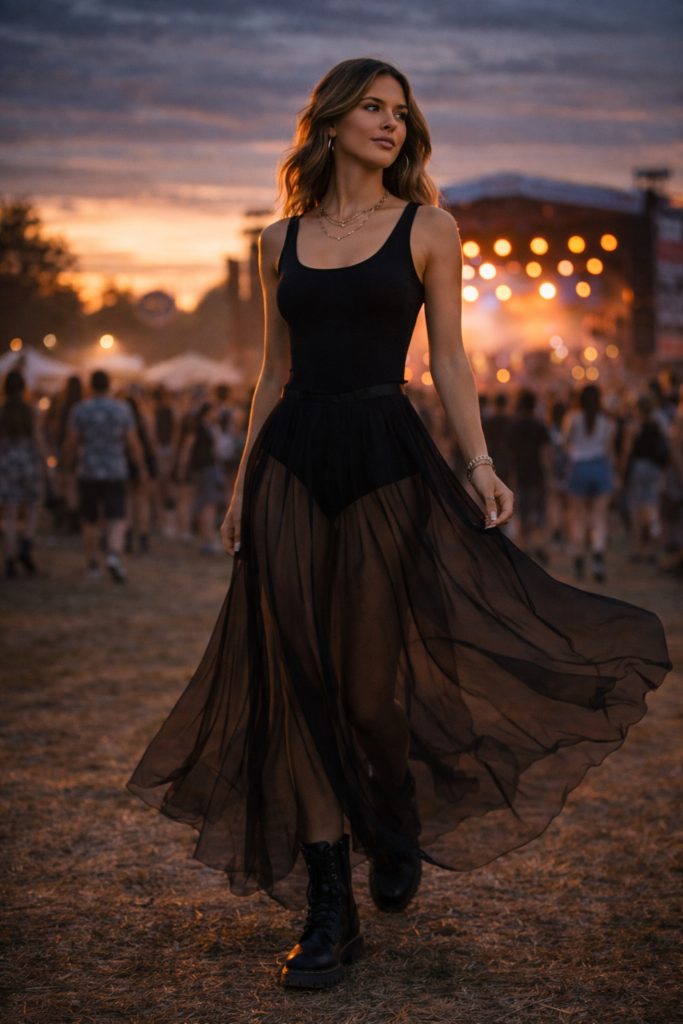 Sheer layers are everywhere this season, and they bring a fashion-forward twist to your summer concert outfit 2026. A flowy sheer maxi skirt layered over a fitted bodysuit feels dramatic yet breathable for warm nights. Choose dark neutrals for an edgy vibe or soft pastels for something more romantic. Add chunky boots or strappy sandals depending on the venue terrain. This look moves beautifully when you walk and feels elevated enough for influencer-worthy photos.