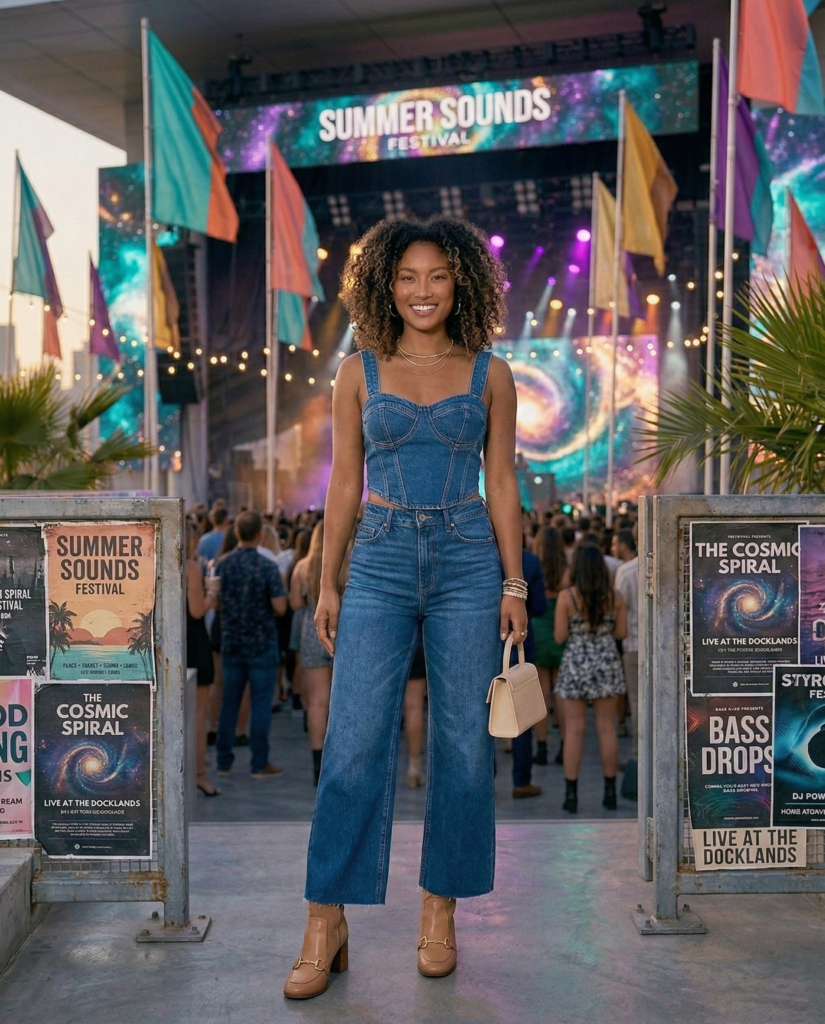 Denim on denim is back in a big way, and it feels fresh for a summer concert outfit 2026. Pair a denim bustier or fitted top with matching jeans or a maxi skirt for a cohesive look. Play with washes — light with dark or vintage blue with crisp white. Add metallic accessories or bold boots to break up the monotone. This outfit feels confident, structured, and undeniably cool.