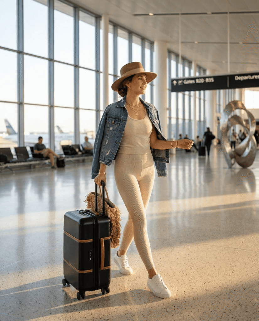 Long travel days call for comfort, but that doesn’t mean sacrificing style. A coordinated athleisure set in a neutral tone looks sleek while keeping you comfortable in transit. Layer with a denim jacket and pair with clean white sneakers. Among practical summer vacation outfits women swear by, a chic lounge set keeps you looking put together from airport to arrival.
