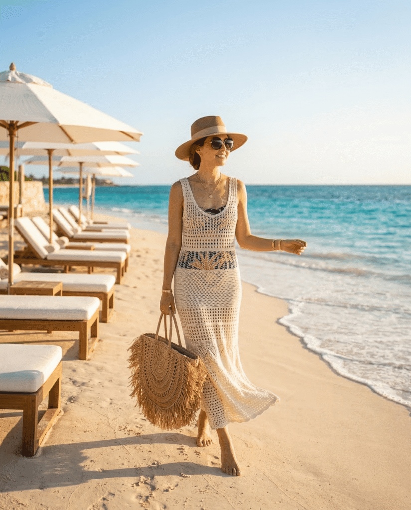 A crochet dress layered over your favorite bikini creates texture and visual interest without feeling heavy. It’s breathable, beachy, and perfect for poolside lounging or seaside lunches. Stick with neutral tones for a timeless feel or go bold with rich color. For memorable beach vacation outfits, crochet details always add that extra touch of vacation charm.