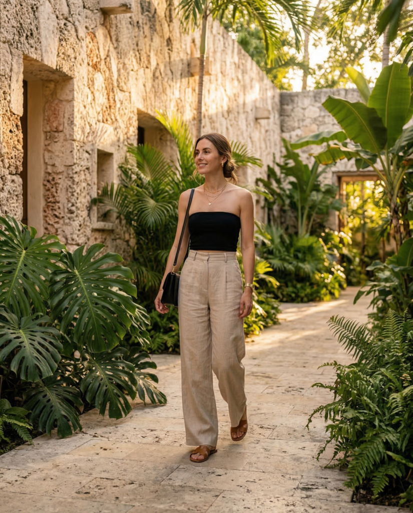 Linen trousers styled with a minimalist bandeau top create a sleek, heat-friendly outfit that feels effortlessly chic. This pairing works beautifully for tropical destinations where temperatures stay high well into the evening. Add flat leather sandals and a structured handbag for balance. It’s a modern take on summer vacation outfits women can wear for both exploring and relaxing.