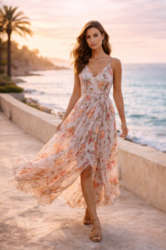 A floral maxi dress is one of those pieces that always earns a spot in my suitcase. It moves beautifully in ocean breezes and works for everything from beach strolls to sunset dinners. Look for lightweight fabrics like chiffon or cotton that won’t cling in the heat. Styled with strappy sandals and delicate gold jewelry, this is one of the most romantic summer vacation outfits women can wear on a tropical getaway.