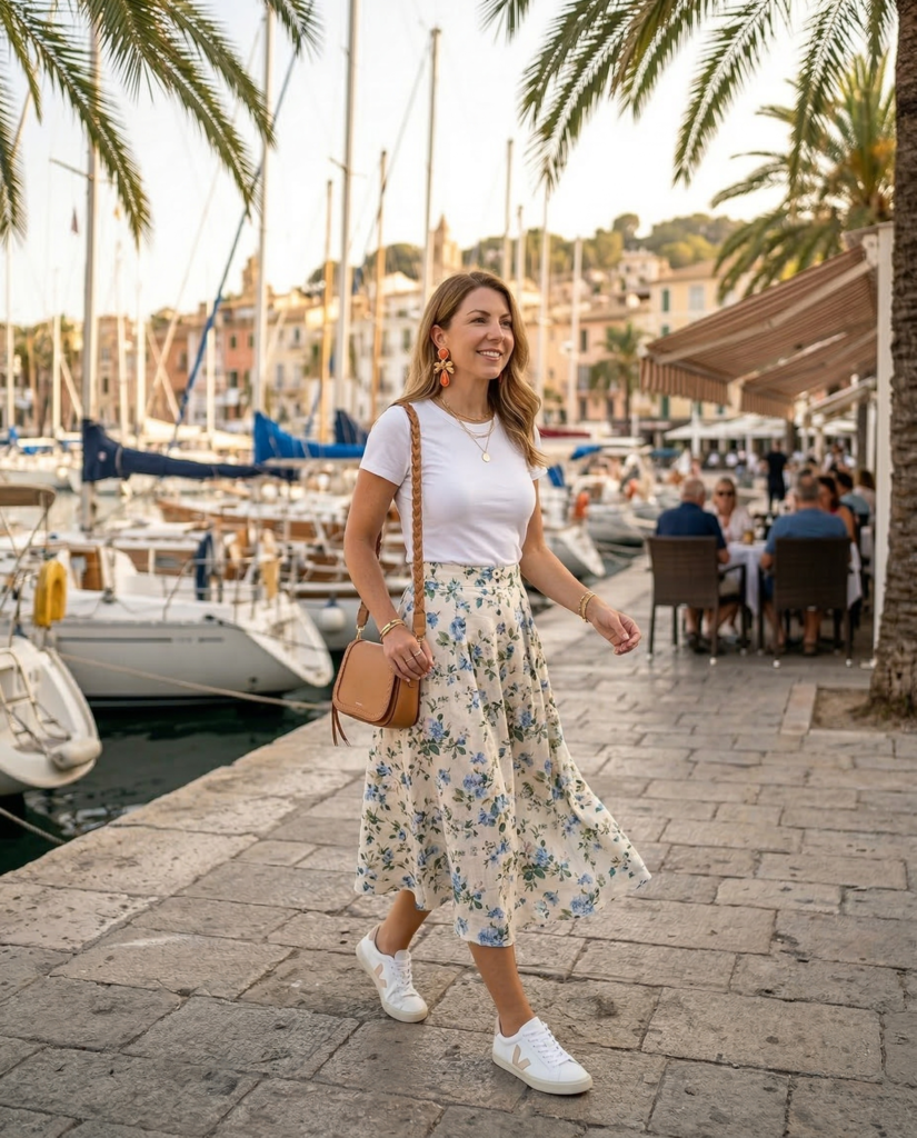 A high-waisted midi skirt styled with a fitted tee creates an easy balance of flow and structure. This look works beautifully for museum visits, brunch dates, or casual dinners by the water. Tuck in the tee to define your waist and add simple sneakers or slides for comfort. It’s one of those summer vacation outfits women appreciate for its mix of femininity and practicality.