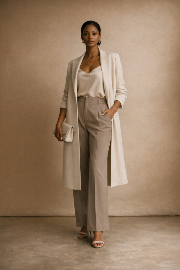 Neutral tones like cream, taupe, or soft gray can feel incredibly romantic at night. Keep the look cohesive from head to toe. Texture is key, so mix knits, silk, or suede. It’s understated but very fashion-forward.
