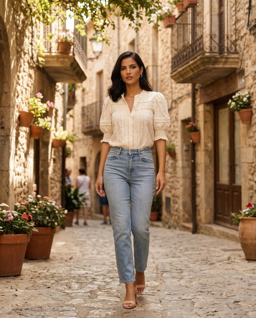 Puff sleeves add volume and drama to simple silhouettes. Balance the look with classic straight-leg jeans. Neutral heels or sandals keep it day-to-night ready. It’s feminine without feeling overly sweet.