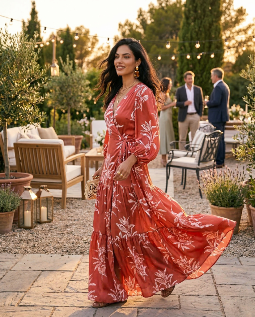 A wrap dress flatters almost every body type. Choose bold prints or vibrant solids for impact. Statement earrings draw attention upward and complete the look. It’s an effortless option for special summer occasions.