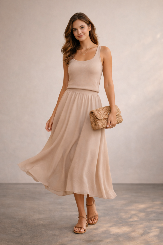Coordinated sets are some of the most trendy summer outfits right now. A fitted tank and flowy midi skirt in the same fabric instantly look put-together. Opt for neutral tones or soft pastels for a modern touch. Add strappy sandals and a woven clutch to complete the look with sophistication.