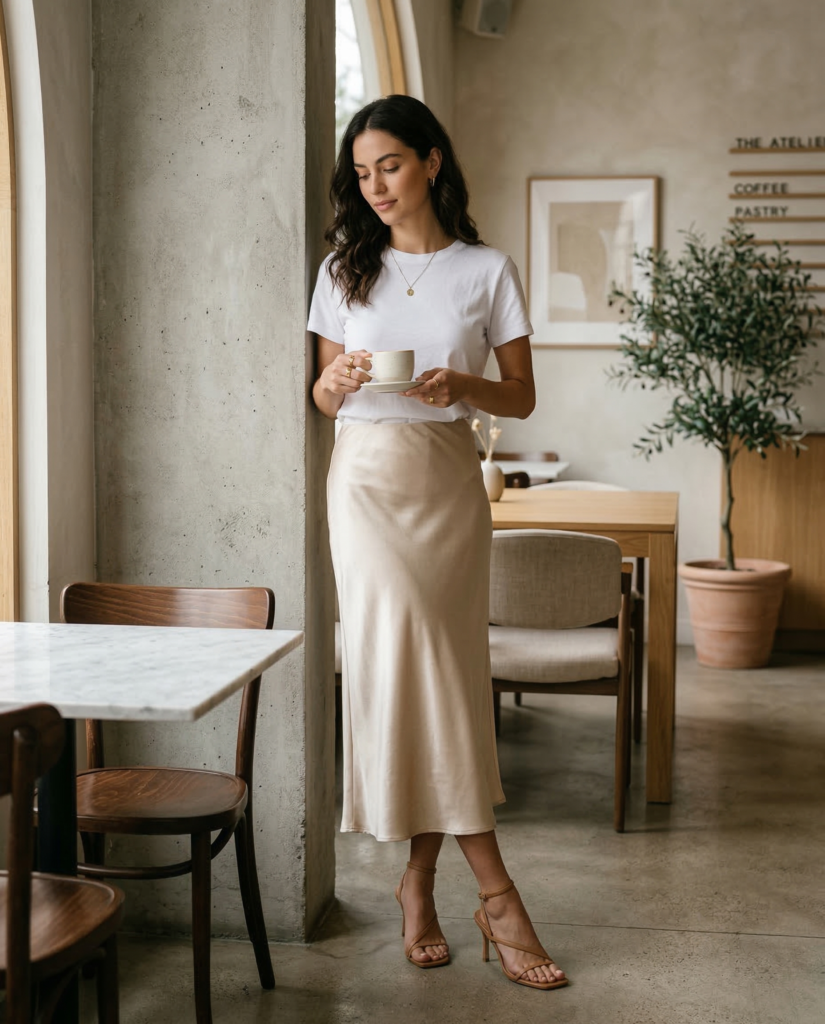 A satin midi skirt instantly elevates a classic white tee. Tuck the tee in and add delicate jewelry for refinement. Strappy heels or dressy sandals pull everything together. This mix of casual and luxe defines modern cute summer outfits.