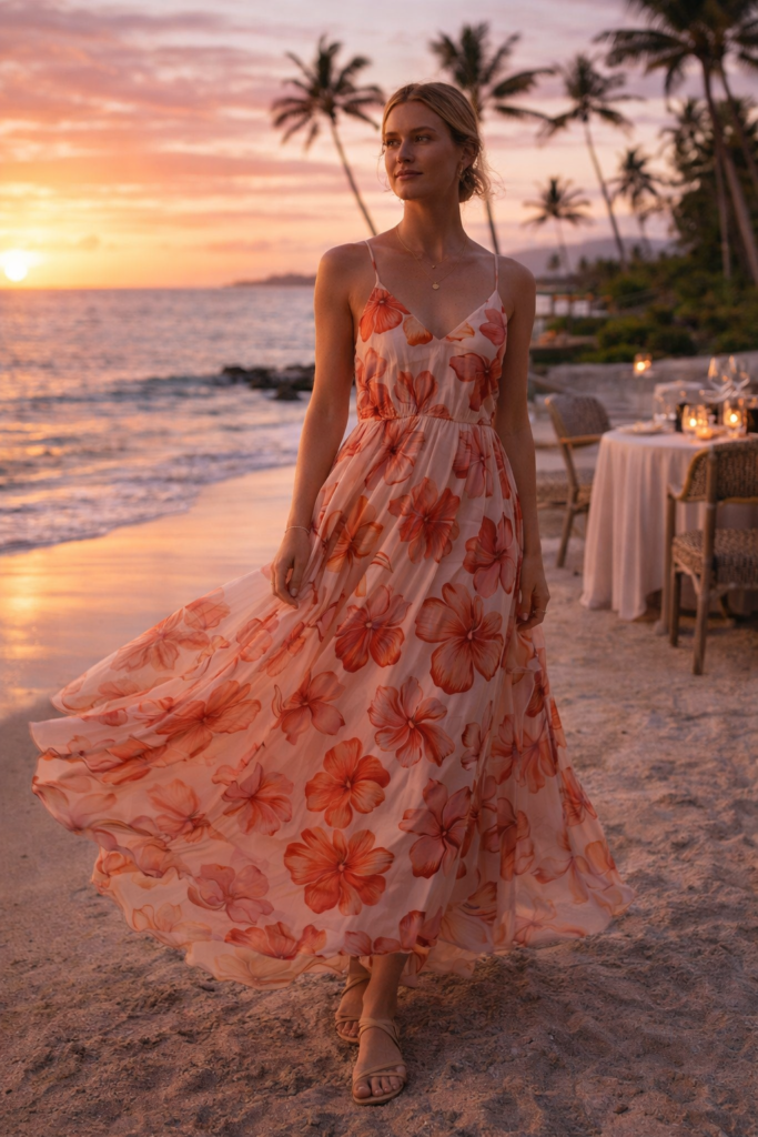 A flowing tropical maxi dress is a forever favorite for Hawaii vacation outfits 2026. Look for bold hibiscus prints or oversized palm motifs in sunset shades. Pair it with minimalist strappy sandals and delicate gold jewelry to keep the look refined. It’s effortless, dramatic, and ideal for beachside dinners.