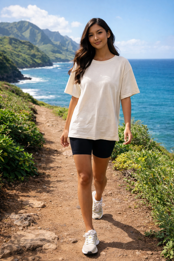 For active island days, bike shorts and an oversized tee feel easy and current. Choose moisture-wicking materials for comfort. Sneakers or sporty sandals keep it practical. It’s ideal for scenic hikes or travel days.