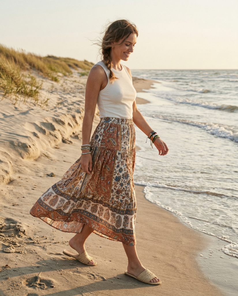 A flowy boho maxi skirt brings soft movement to Hawaii outfits women adore. Pair it with a fitted tank to balance proportions. Add layered bracelets and woven slides. It’s perfectly relaxed yet styled.