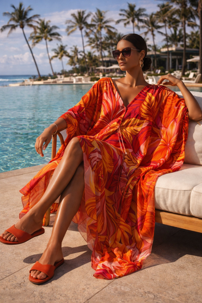 A vibrant kaftan is dramatic in the best way. Look for bold island-inspired prints and breezy fabrics. Slip into minimal flat slides to keep the spotlight on the silhouette. It’s effortless glamour.