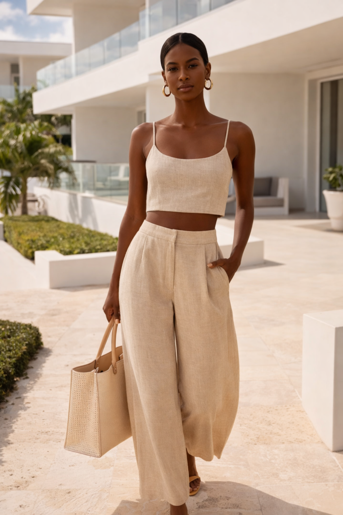 Linen pants styled with a structured bralette feel modern and airy. Add a light layer if desired. Earth tones look especially elevated. It’s cool without trying too hard.