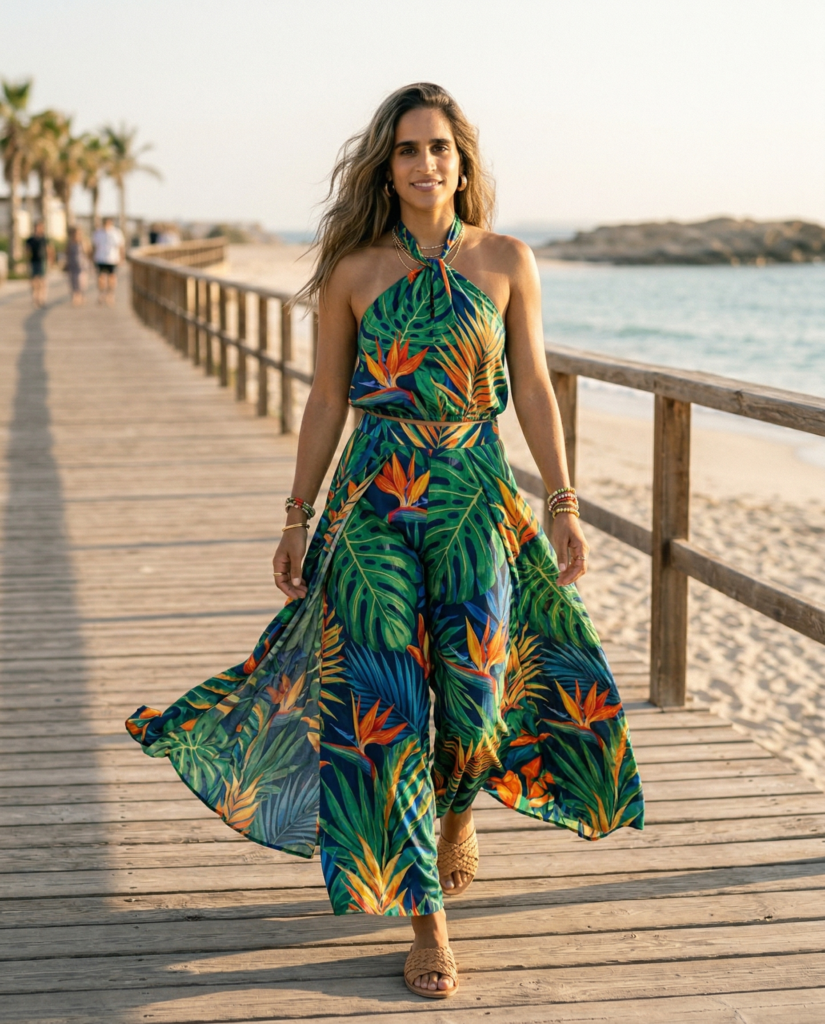 A silky slip dress feels quietly luxurious in tropical settings. Choose muted sunset hues or earthy tones for 2026. Layer delicate gold chains and simple sandals. It’s sleek, modern, and easy to dress up or down.