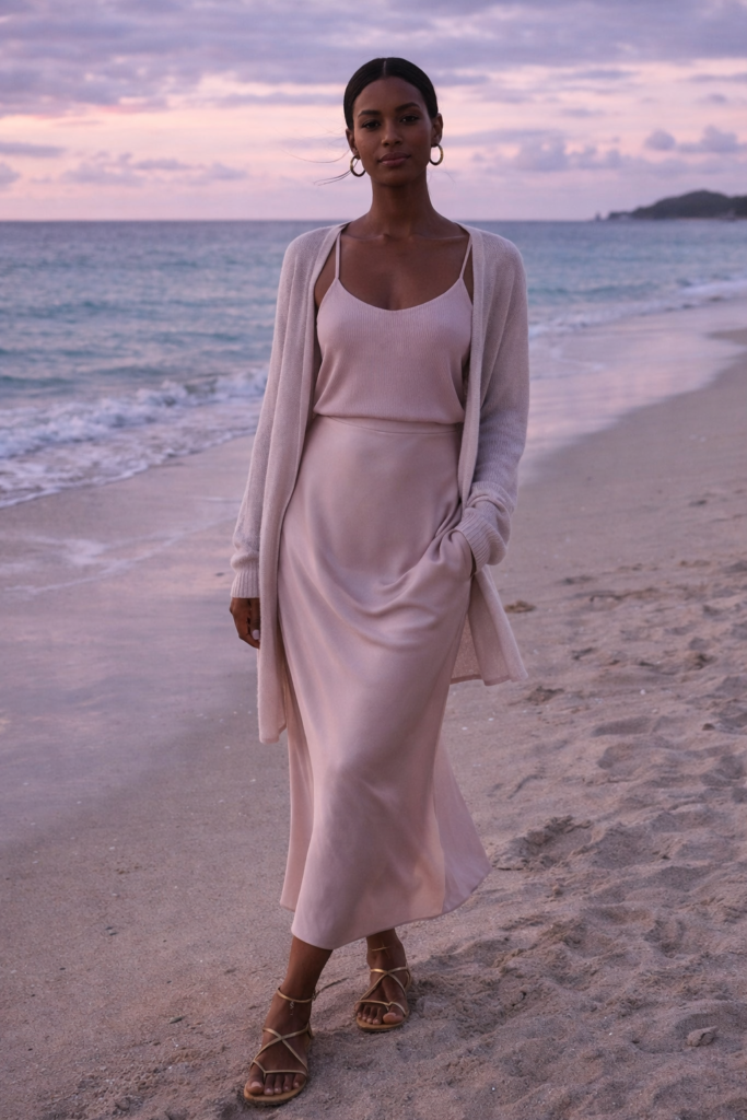 Evenings can feel breezy, so layer a lightweight cardigan over a slip skirt and tank. Soft pastel shades feel fresh for Hawaii vacation outfits 2026. Add strappy sandals and a clutch. It’s cozy yet refined.