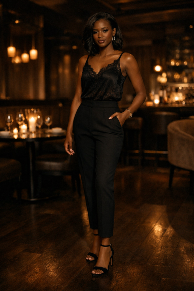 A black outfit doesn’t have to feel basic when you add a soft, romantic detail. Lace, sheer accents, or a subtle neckline elevate this look instantly. It’s ideal if you prefer understated elegance with a sultry edge.