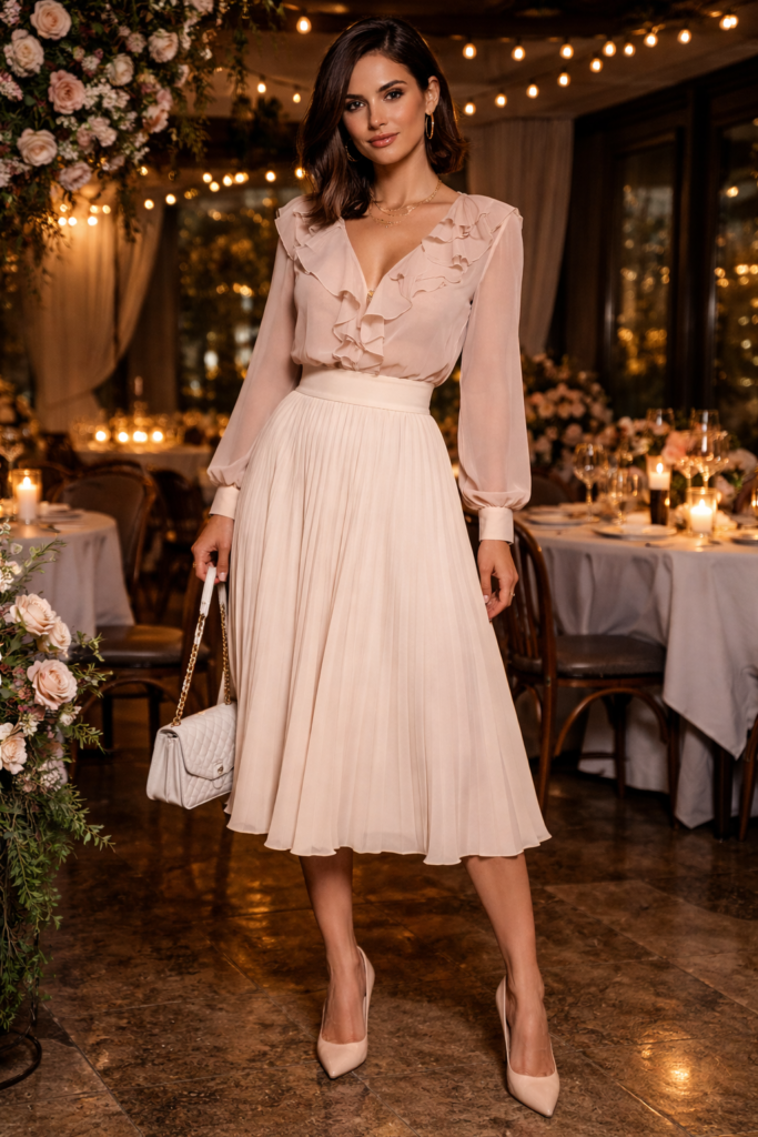 This outfit is romantic, playful, and incredibly flattering. A soft blouse paired with a statement skirt feels curated and intentional. It’s perfect for showcasing personality through texture and color.