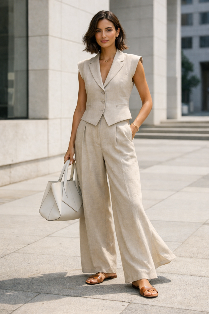 Matching linen sets are leading the Trendy Summer Outfits 2026 movement, and for good reason. A tailored linen vest paired with high-waisted, wide-leg trousers feels polished yet completely breathable for hot days. The key this year is structure—sharp shoulders, clean lines, and intentional tailoring that elevates the relaxed fabric. Neutral tones like sand, ivory, and warm clay feel especially current.