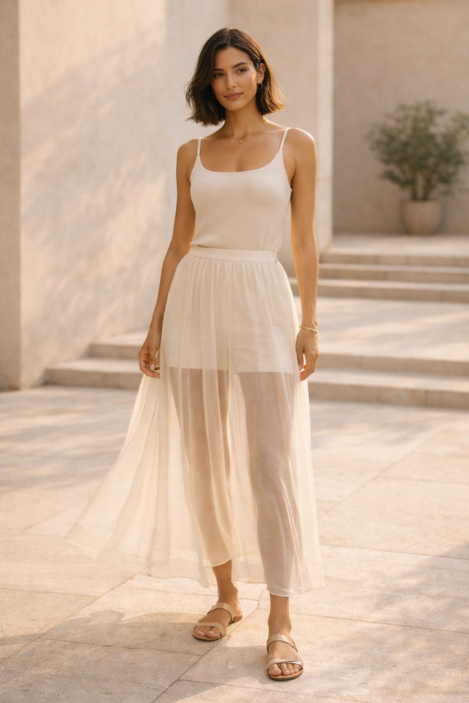 Sheer fabrics are everywhere for summer 2026, but the styling is sophisticated rather than daring. Think a lightweight sheer maxi skirt layered over fitted shorts or a tonal bodysuit, or a translucent button-down worn over a sleek tank and tailored shorts. It’s about creating dimension while keeping the silhouette clean and balanced.
