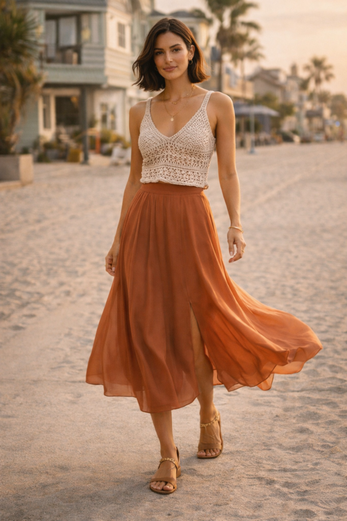 Pair with woven sandals and layered gold necklaces for texture without excess. The difference in 2026 is polish; silhouettes are streamlined rather than overly voluminous. I love how this look feels romantic yet grown-up, ideal for summer festivals, beach towns, or relaxed outdoor gatherings.